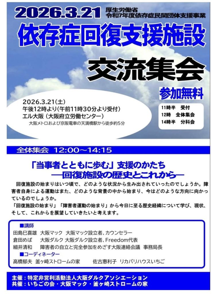 2026年3月21日、「依存症回復支援施設 交流集会」が大阪にて開催され、私たち木津川ダルクも参加しました。