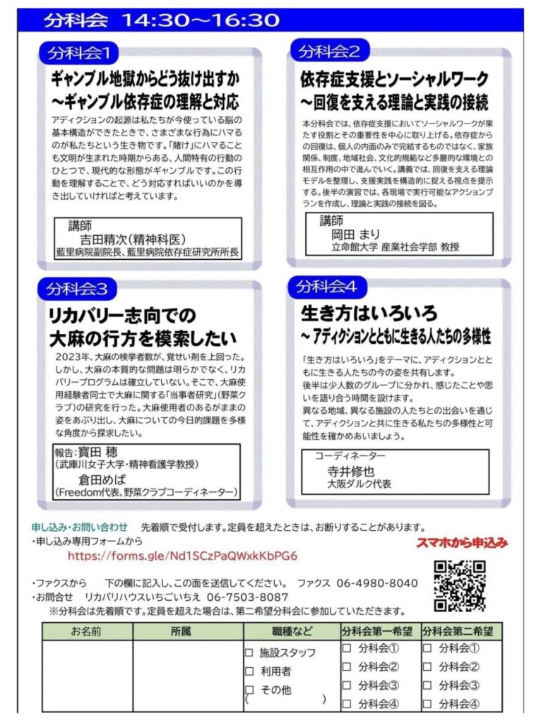 午後の分科会では、ギャンブル依存症への理解と対応、ソーシャルワークの視点からの支援、大麻をめぐる課題、そして「生き方の多様性」など、多角的なテーマが扱われました。それぞれの現場の実践や専門的知見に触れることで、支援の幅と奥深さを実感しました。
