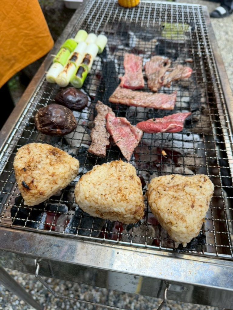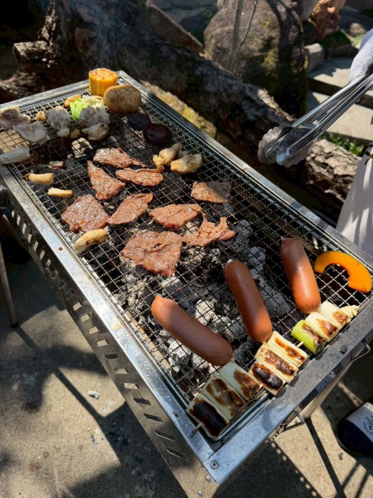 お楽しみのバーベキューでは、炭火で焼く香ばしいお肉やウィンナー、そして旬の野菜や焼きおにぎりに舌鼓。外で仲間と一緒に囲む食事は格別の美味しさで、あちこちで笑顔と会話が弾む賑やかなひとときとなりました。