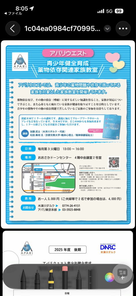 ■アパリウエスト家族教室 アパリウエスト家族教室2025年後期日程 アパリウエストでは、薬物の問題で困っている家族を対象とした家族教室を開催しています。 薬物依存等... -